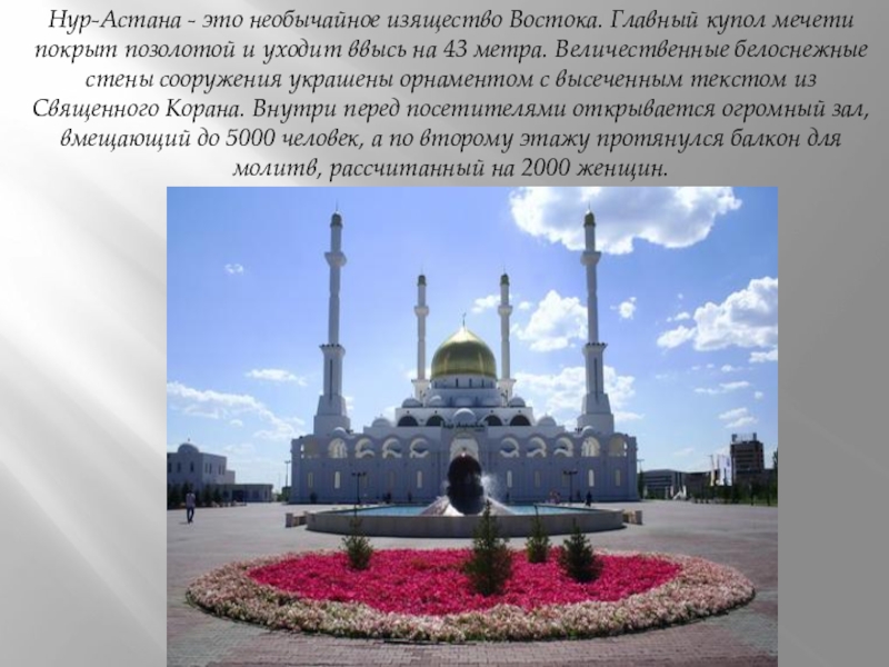 Слайд 10Нур-Астана - это необычайное изящество Востока. Главный купол мечети покрыт позолотой
