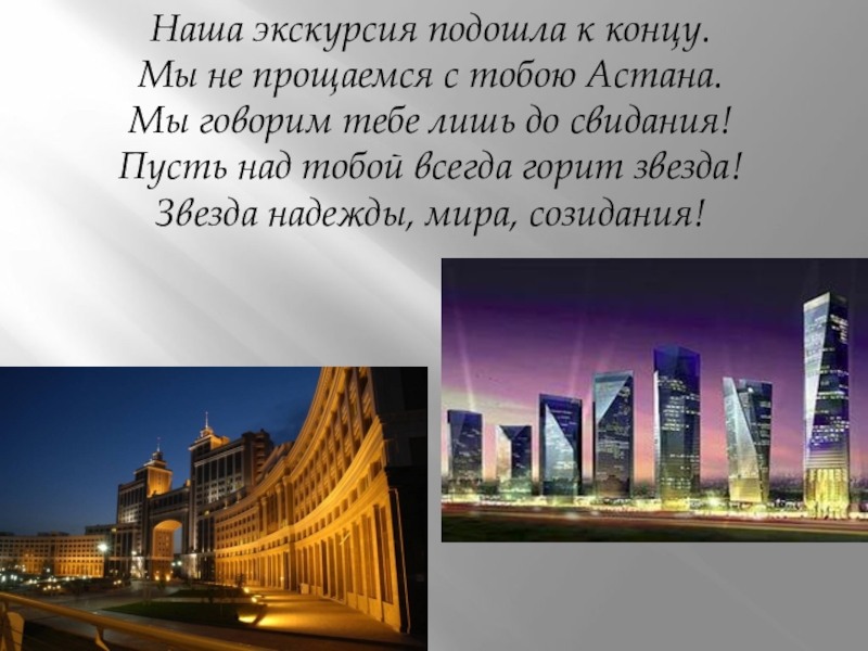 Мы не прощаемся с тобою Астана. Мы говорим тебе лишь до свидания! Пусть над тобой всегда горит звезда! Звезда надежды, мира, созидания!