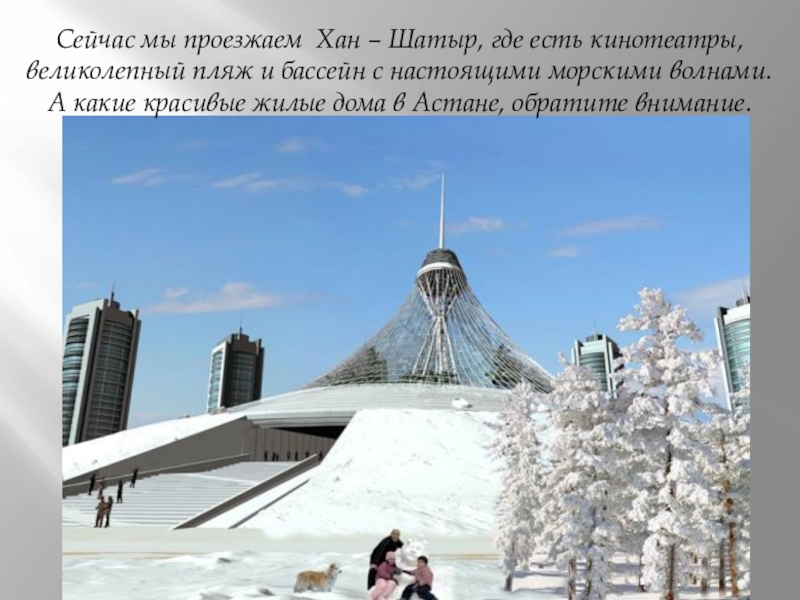 Слайд 5Сейчас мы проезжаем Хан – Шатыр, где есть кинотеатры, великолепный пляж