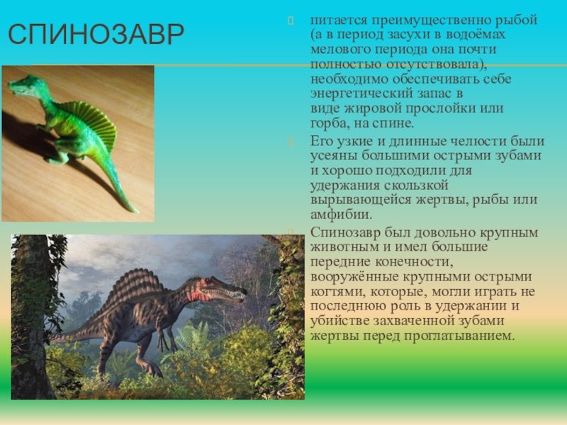 Спинозавр был довольно крупным животным и имел большие передние конечности, вооружённые крупными острыми когтями, которые, могли играть не последнюю роль в удержании и убийстве захваченной зубами жертвы перед проглатыванием.