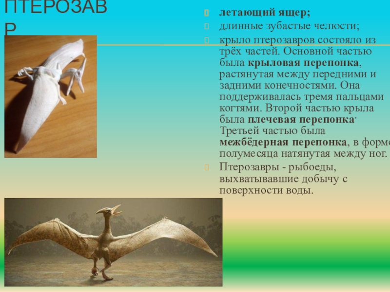 Птерозавры - рыбоеды, выхватывавшие добычу с поверхности воды.