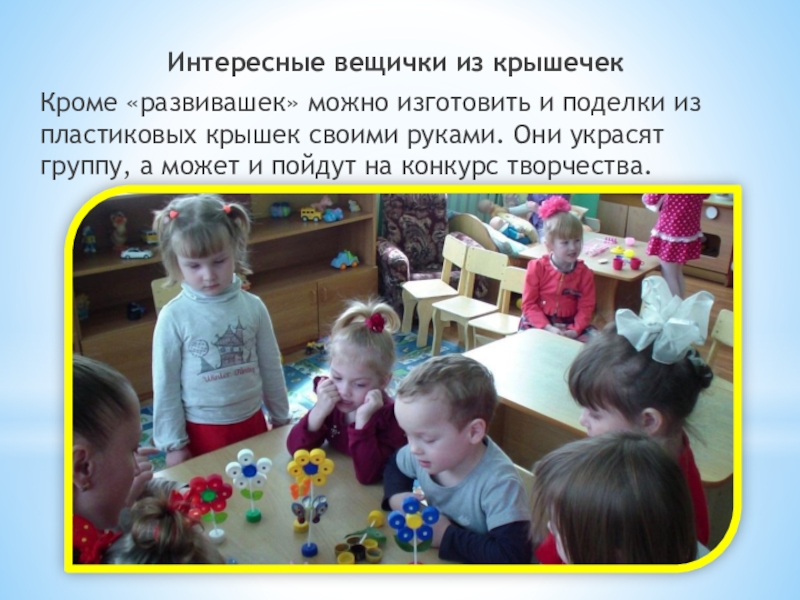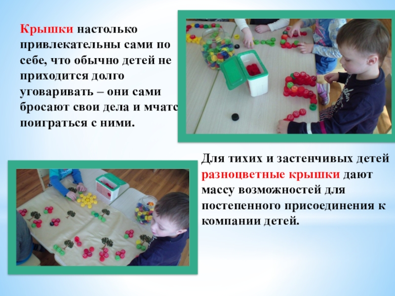 Для тихих и застенчивых детей разноцветные крышки дают массу возможностей для постепенного присоединения к компании детей.