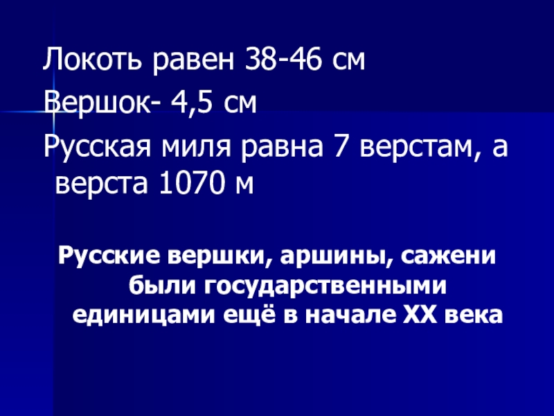 Локоть равен 38-46 см Вершок- 4,5 см Русская миля равна 7 верстам, а верста 1070 мРусские