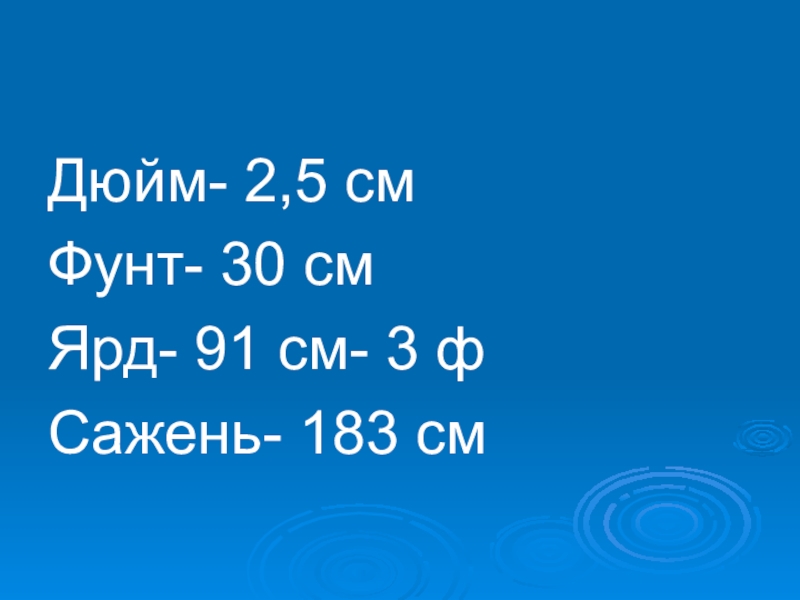 Дюйм- 2,5 смФунт- 30 смЯрд- 91 см- 3 фСажень- 183 см