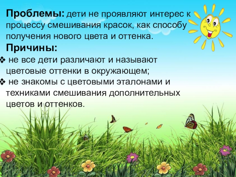 Слайд 4Проблемы: дети не проявляют интерес к процессу смешивания красок, как способу