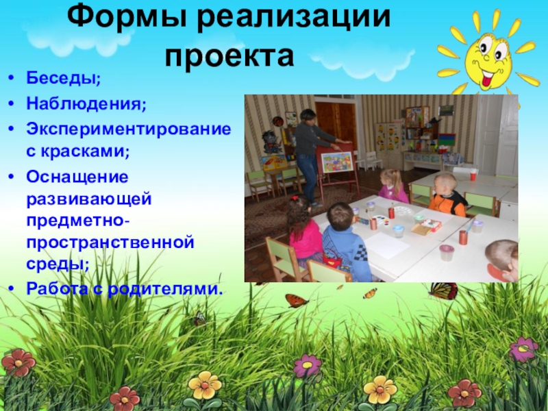 Формы реализации проектаБеседы;Наблюдения;Экспериментирование с красками;Оснащение развивающей предметно-пространственной среды;Работа с родителями.