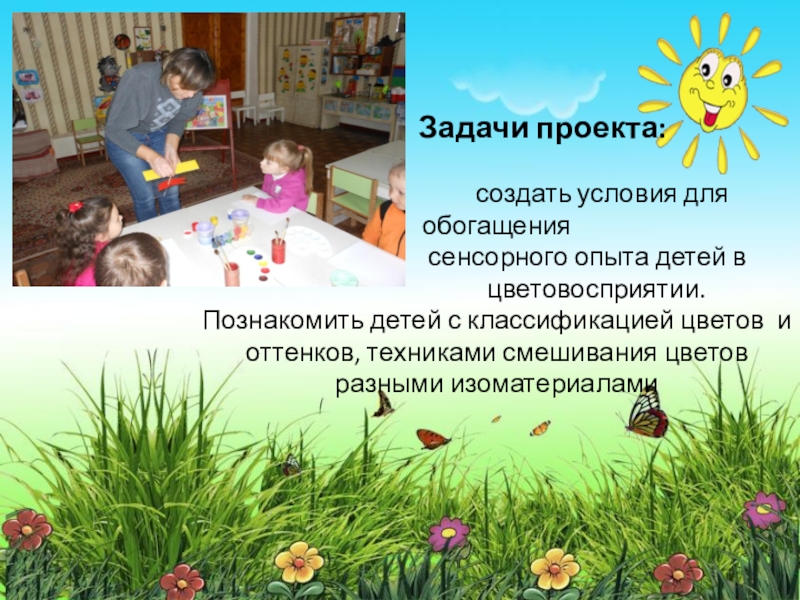 создать условия для обогащения сенсорного опыта детей в цветовосприятии. Познакомить детей с классификацией цветов и оттенков, техниками смешивания цветов разными изоматериалами