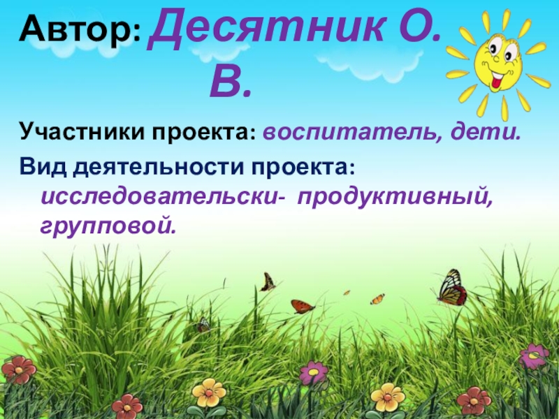 Участники проекта: воспитатель, дети.Вид деятельности проекта: исследовательски- продуктивный, групповой.Автор: Десятник О.В.