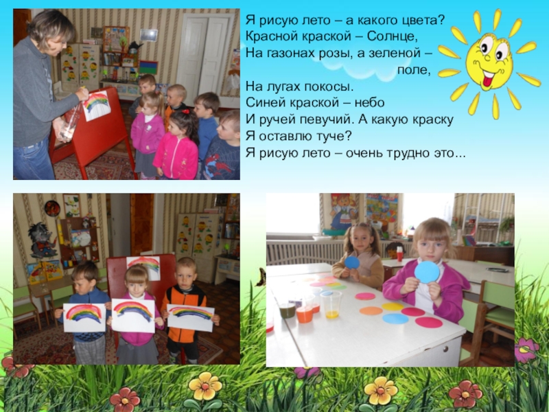 Я рисую лето – а какого цвета? Красной краской – Солнце, На газонах розы, а зеленой –