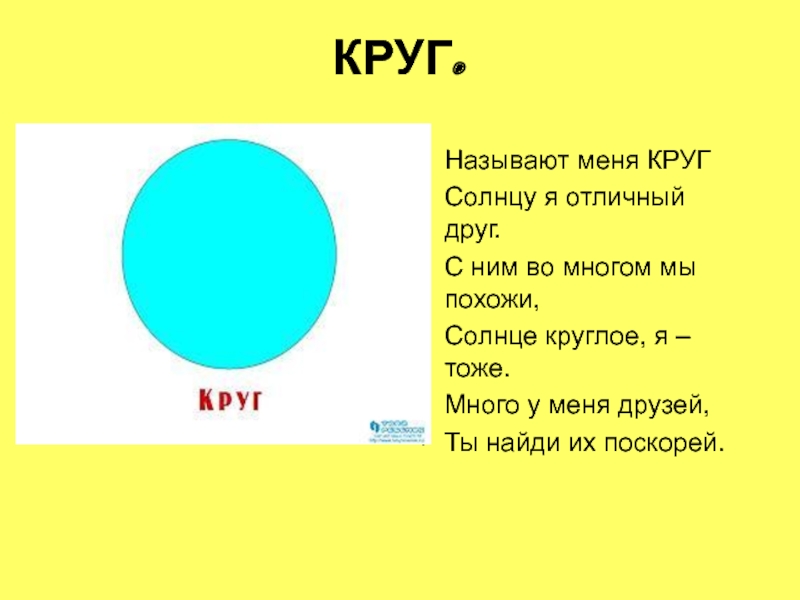 КРУГ.Называют меня КРУГСолнцу я отличный друг.С ним во многом мы похожи,Солнце круглое, я – тоже.Много у меня
