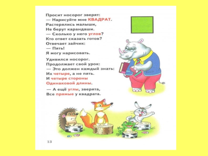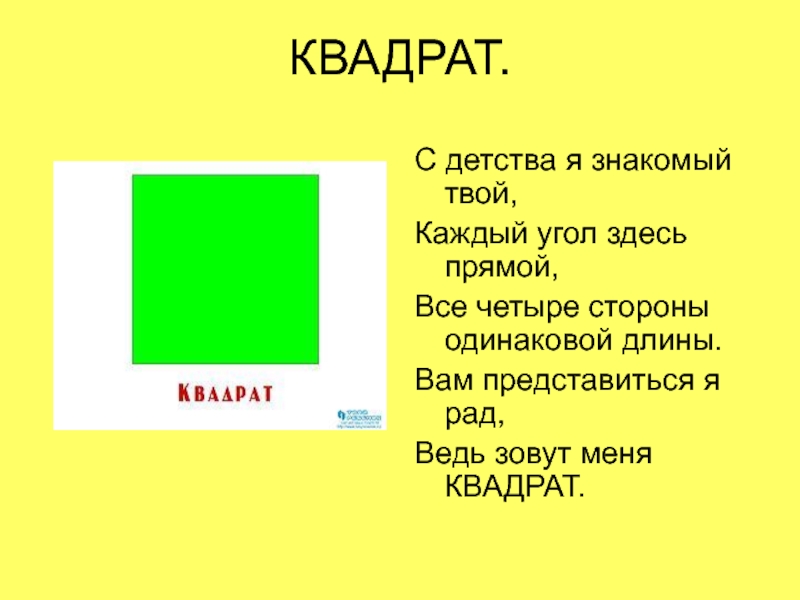 КВАДРАТ.С детства я знакомый твой, Каждый угол здесь прямой,Все четыре стороны одинаковой длины.Вам представиться я рад, Ведь