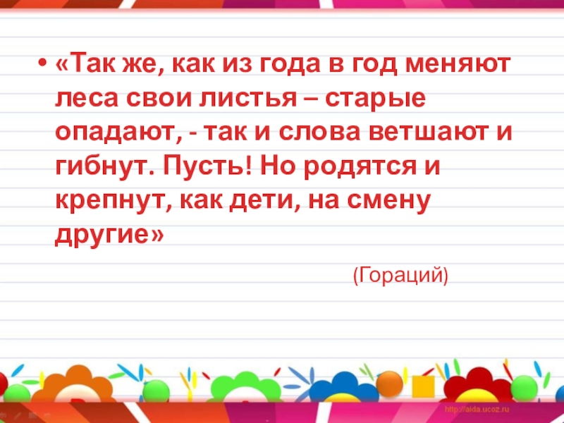 – старые опадают, - так и слова ветшают и гибнут. Пусть! Но родятся и крепнут, как дети, на смену другие»