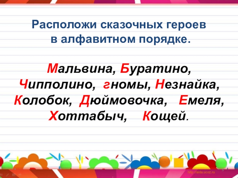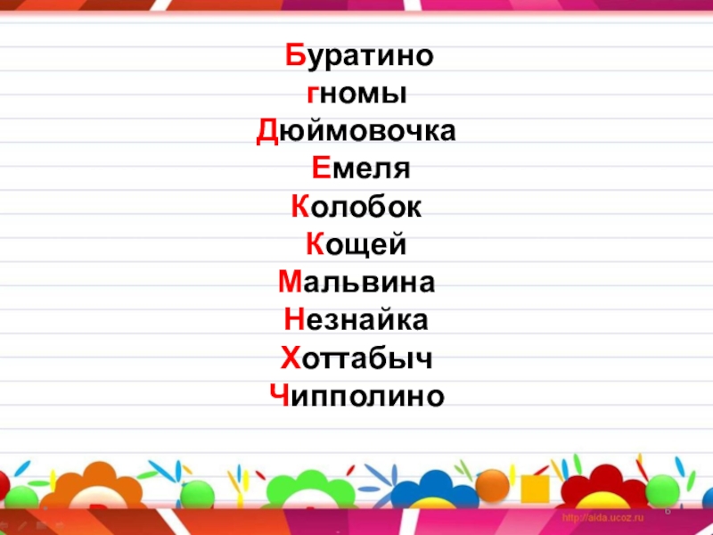 Мальвина, Буратино, Чипполино, гномы, Незнайка,