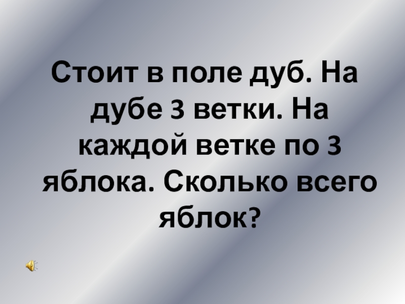 Стоит в поле дуб. На дубе 3 ветки. На каждой ветке по 3 яблока. Сколько всего