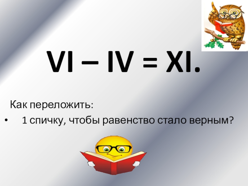 VI – IV = XI.  Как переложить:  1 спичку, чтобы равенство стало верным?