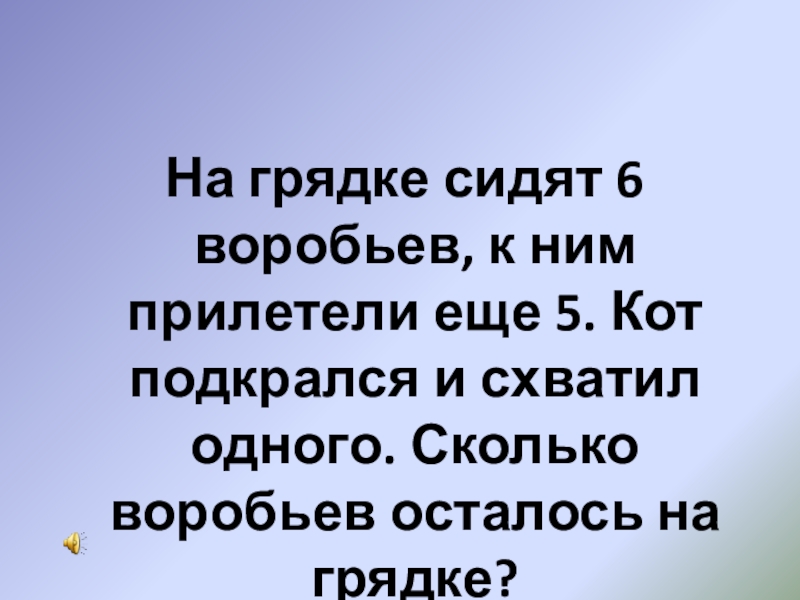 Слайд 10 На грядке сидят 6 воробьев, к ним прилетели еще 5.
