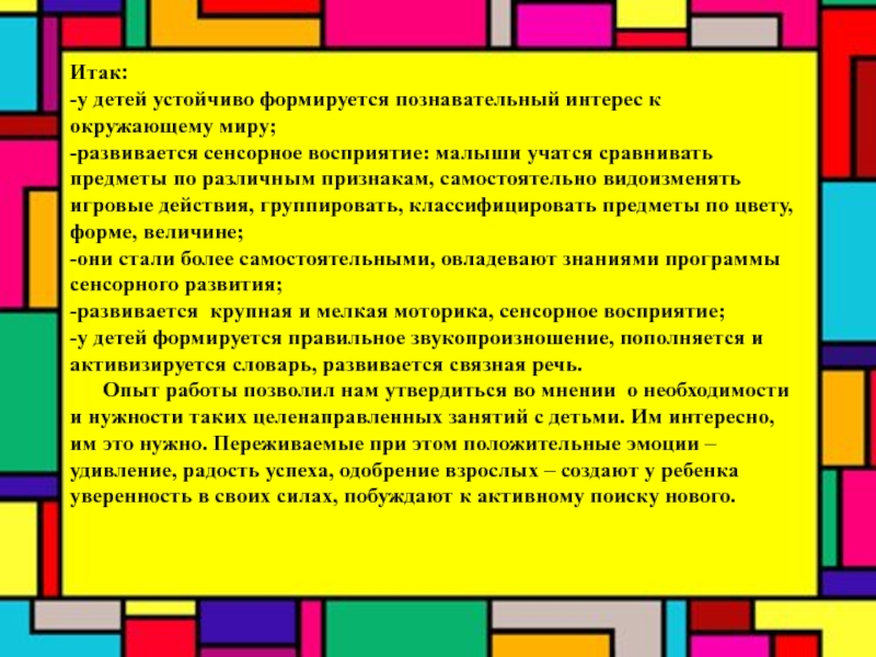 -они стали более самостоятельными, овладевают знаниями программы сенсорного развития;