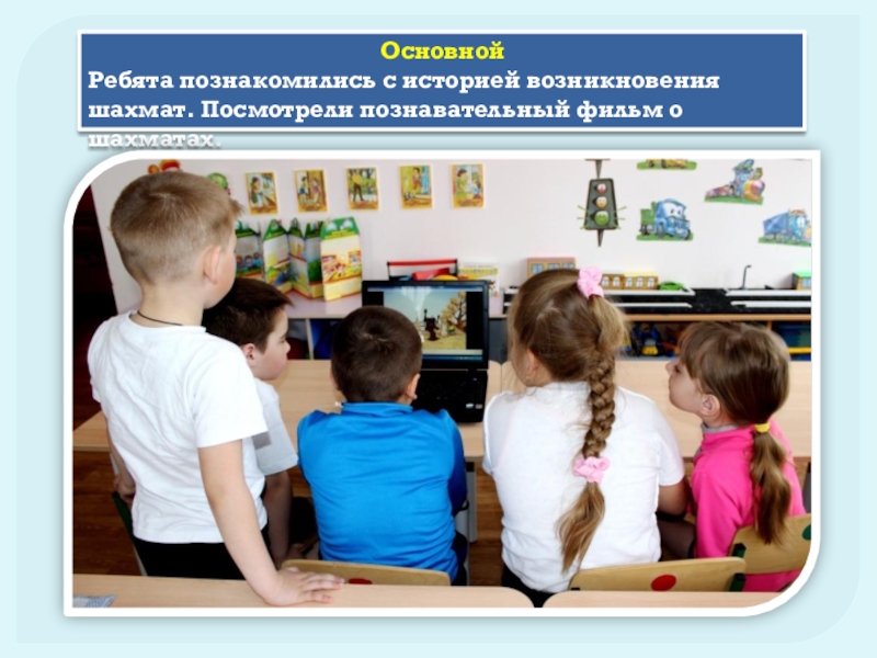 Основной Ребята познакомились с историей возникновения шахмат. Посмотрели познавательный фильм о шахматах.