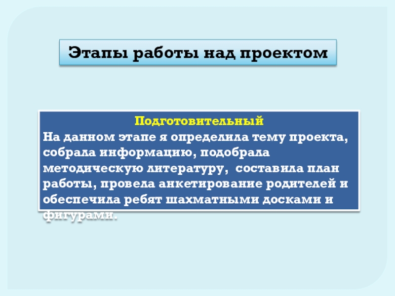 Этапы работы над проектомПодготовительный На данном этапе я определила тему проекта, собрала информацию, подобрала методическую литературу, составила