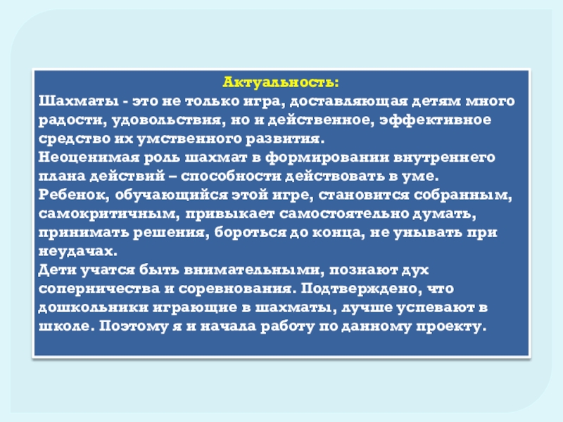 Актуальность:Шахматы - это не только игра, доставляющая детям много радости, удовольствия, но и действенное, эффективное средство их