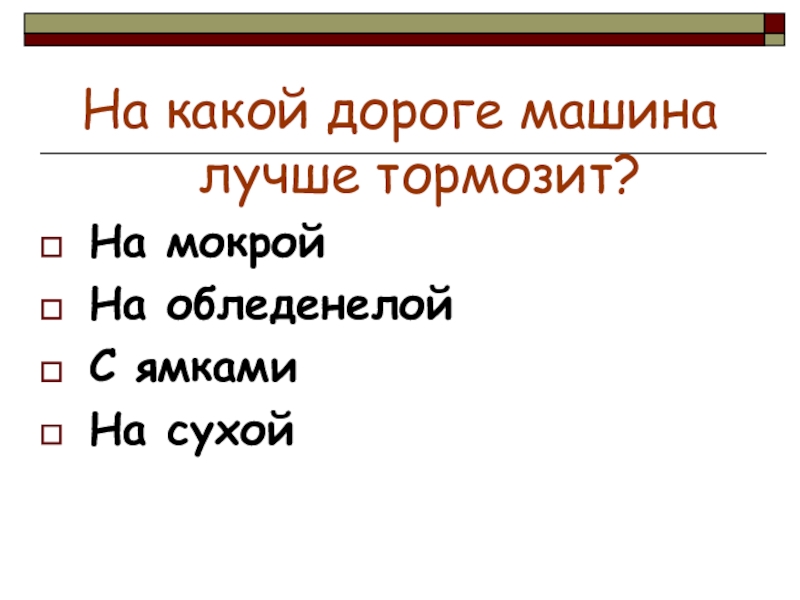 На какой дороге машина лучше тормозит?На мокройНа обледенелойС ямкамиНа сухой
