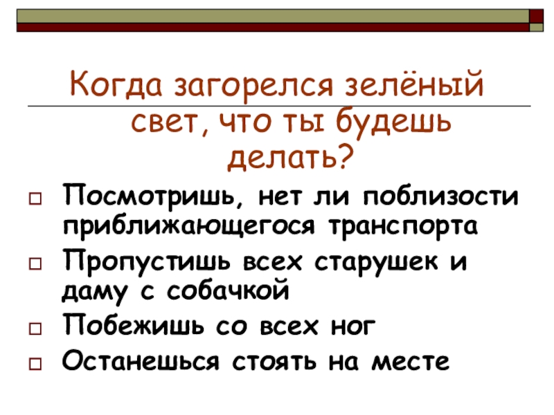 Когда загорелся зелёный свет, что ты будешь делать?Посмотришь, нет ли поблизости приближающегося транспортаПропустишь всех старушек и