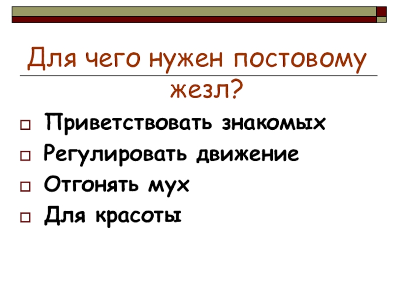 Для чего нужен постовому жезл?Приветствовать знакомыхРегулировать движениеОтгонять мухДля красоты