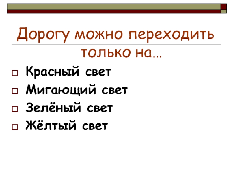 Дорогу можно переходить только на…Красный светМигающий светЗелёный светЖёлтый свет