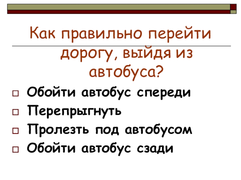 Как правильно перейти дорогу, выйдя из автобуса?Обойти автобус спередиПерепрыгнутьПролезть под автобусомОбойти автобус сзади