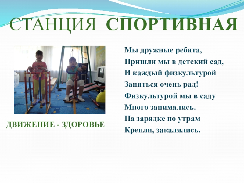 СТАНЦИЯ СПОРТИВНАЯДВИЖЕНИЕ - ЗДОРОВЬЕМы дружные ребята,Пришли мы в детский сад,И каждый физкультуройЗаняться очень рад!Физкультурой мы в