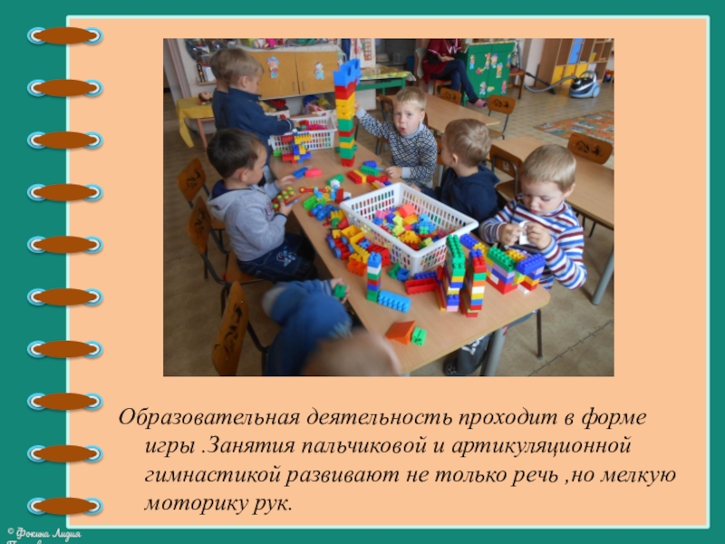 Слайд 8Образовательная деятельность проходит в форме игры .Занятия пальчиковой и артикуляционной гимнастикой