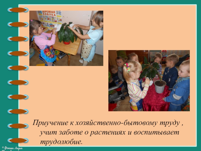 Слайд 11Приучение к хозяйственно-бытовому труду ,учит заботе о растениях и воспитывает трудолюбие.