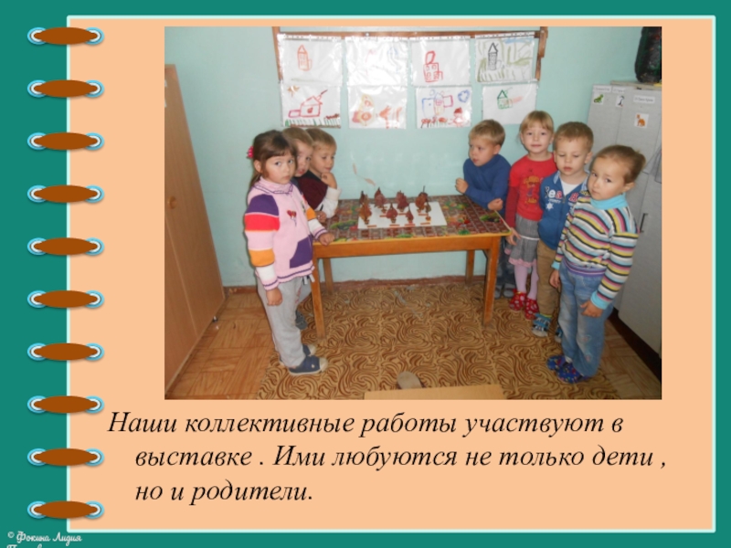 Наши коллективные работы участвуют в выставке . Ими любуются не только дети , но и родители.