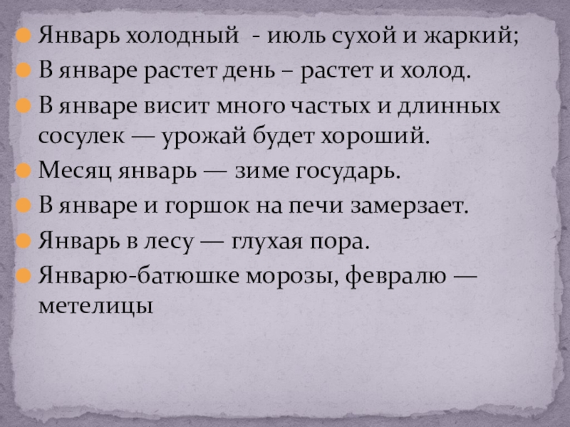 Январь холодный - июль сухой и жаркий;В январе растет день – растет и холод.В январе висит много