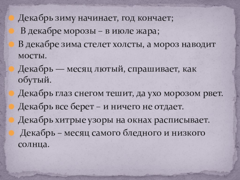 Декабрь зиму начинает, год кончает; В декабре морозы – в июле жара;В декабре зима стелет холсты, а