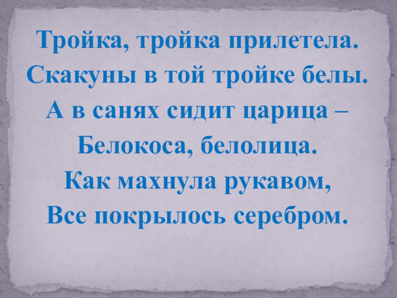 Тройка, тройка прилетела.Скакуны в той тройке белы.А в санях сидит царица – Белокоса, белолица.Как махнула рукавом,Все покрылось серебром.