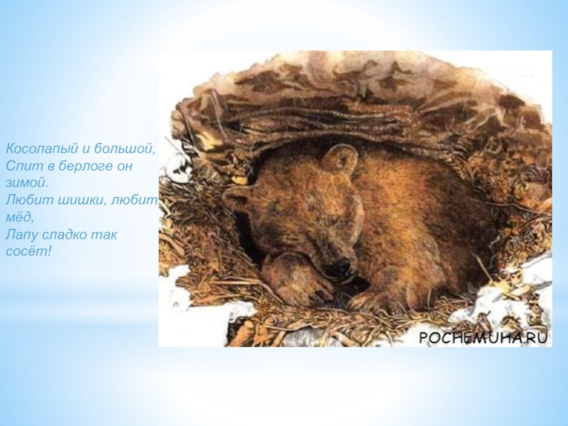 Косолапый и большой,Спит в берлоге он зимой.Любит шишки, любит мёд,Лапу сладко так сосёт!