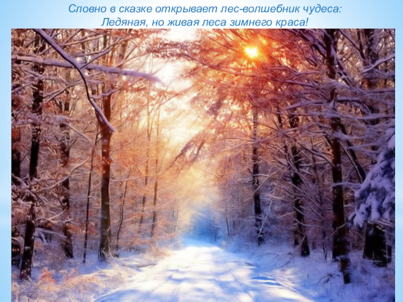 Словно в сказке открывает лес-волшебник чудеса:Ледяная, но живая леса зимнего краса!