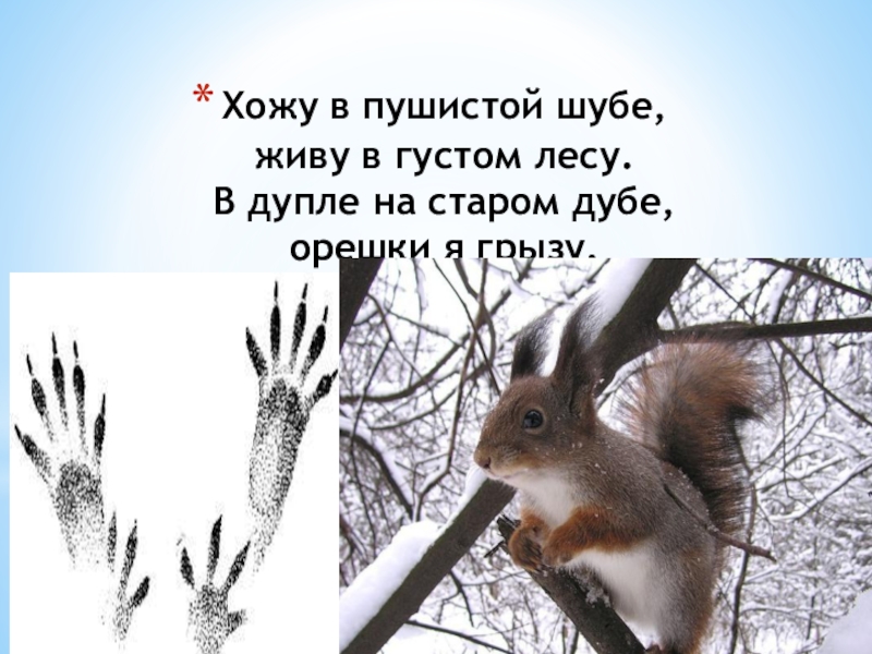 Хожу в пушистой шубе, живу в густом лесу. В дупле на старом дубе, орешки я грызу.