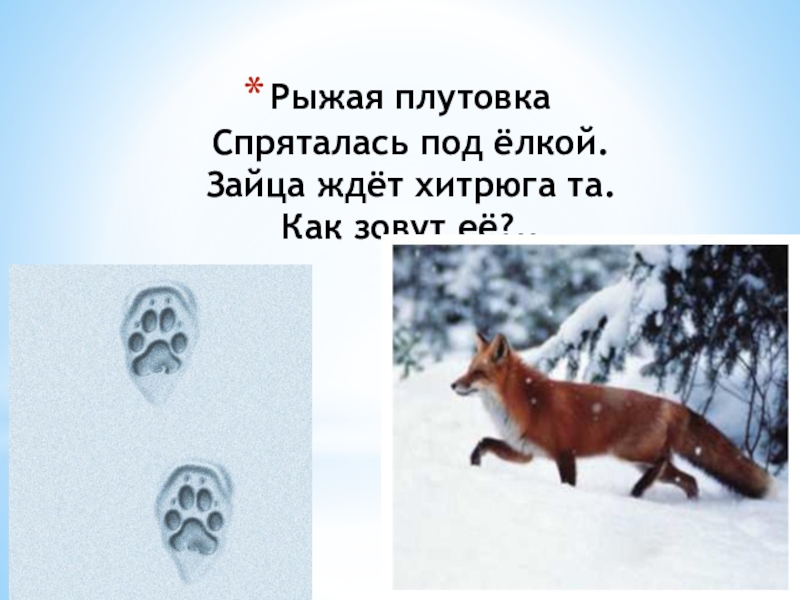 Слайд 9Рыжая плутовка Спряталась под ёлкой. Зайца ждёт хитрюга та. Как зовут её?..
