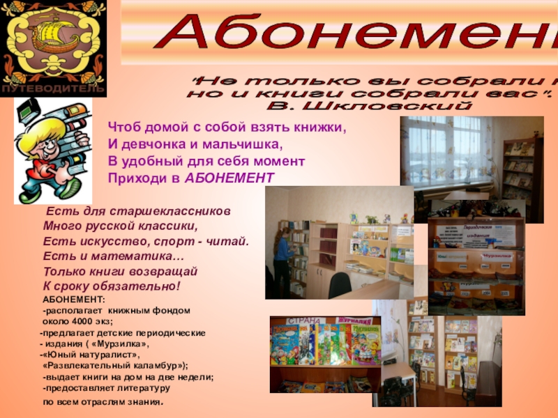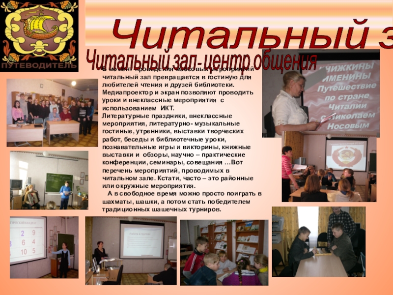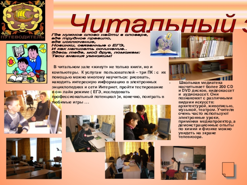 10 наименований газет и журналов, медиатека.