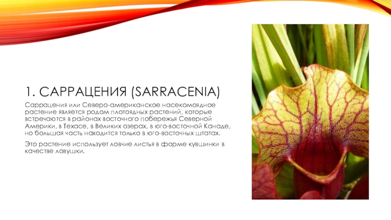 1. Саррацения (Sarracenia)Саррацения или Северо-американское насекомоядное растение является родом плотоядных растений, которые встречаются в районах восточного побережья Северной Америки, в Техасе, в Великих озерах, в юго-восточной Канаде, но большая часть находится только в юго-восточных штатах.Это растение