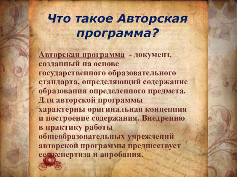 образовательного стандарта, определяющий содержание образования определенного предмета. Для авторской программы характерны оригинальная концепция и построение содержания. Внедрению в практику работы общеобразовательных учреждений авторской программы предшествует ее экспертиза и апробация.