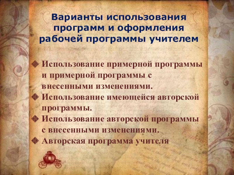 Слайд 10Варианты использования программ и оформления рабочей программы учителем