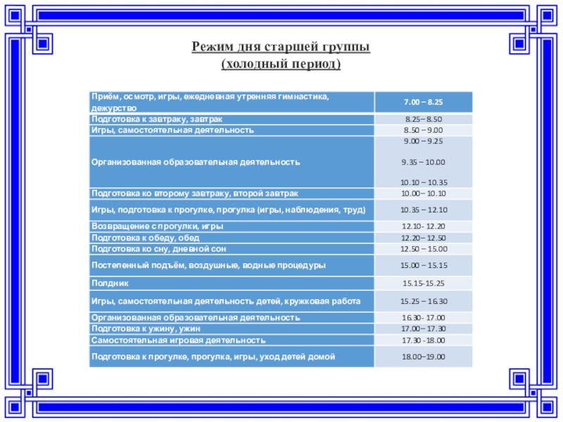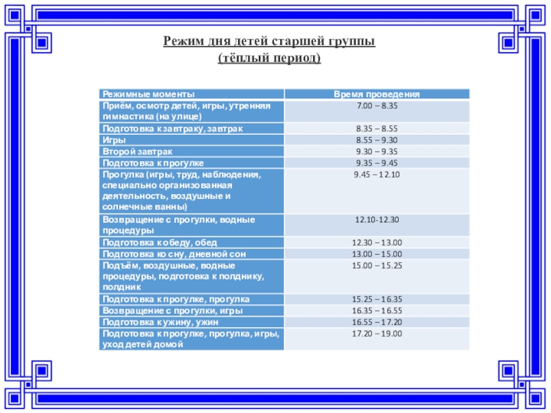 Слайд 22Режим дня детей старшей группы (тёплый период)