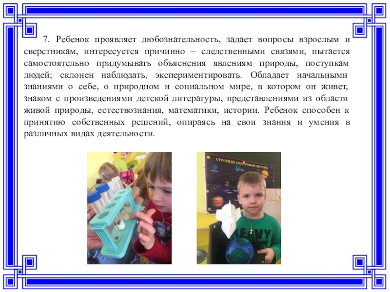 – следственными связями, пытается самостоятельно придумывать объяснения явлениям природы, поступкам людей; склонен наблюдать, экспериментировать. Обладает начальными знаниями о себе, о природном и социальном мире, в котором он живет, знаком с произведениями детской литературы, представлениями из области живой природы, естествознания, математики, истории. Ребенок способен к принятию собственных решений, опираясь на свои знания и умения в различных видах деятельности.