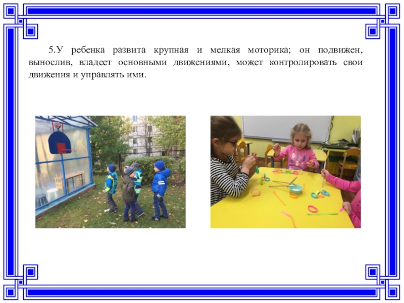 Слайд 95.У ребенка развита крупная и мелкая моторика; он подвижен, вынослив, владеет