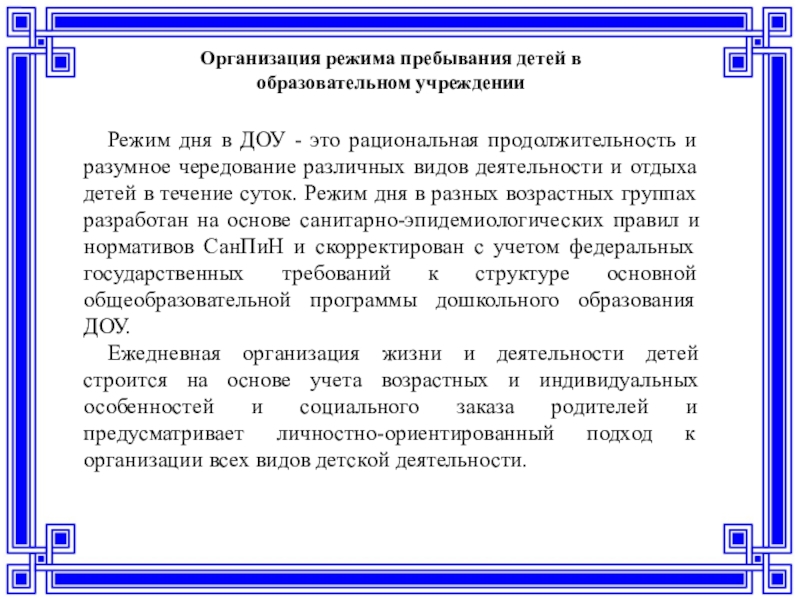 Слайд 18Организация режима пребывания детей в образовательном учреждении