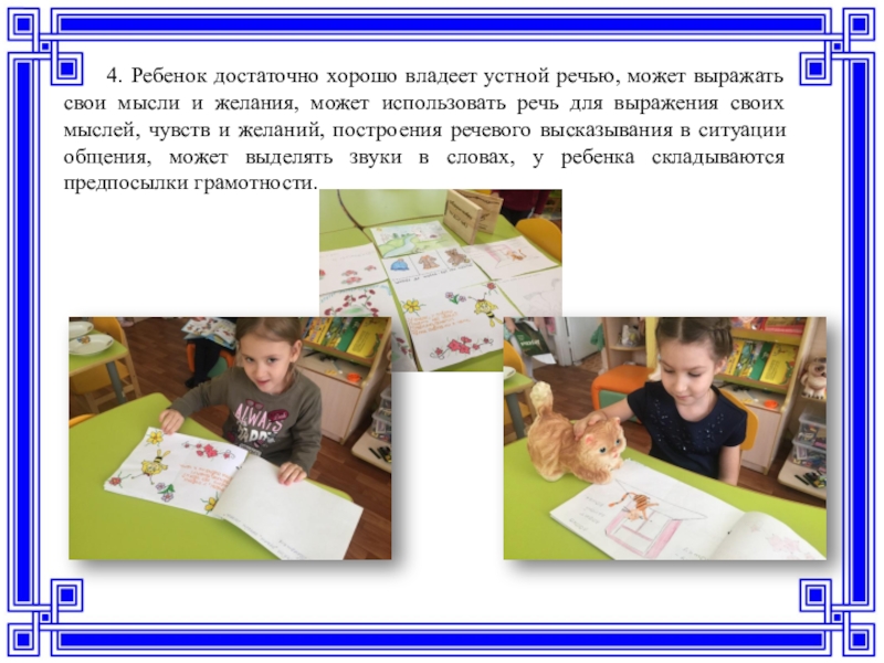 и желания, может использовать речь для выражения своих мыслей, чувств и желаний, построения речевого высказывания в ситуации общения, может выделять звуки в словах, у ребенка складываются предпосылки грамотности.
