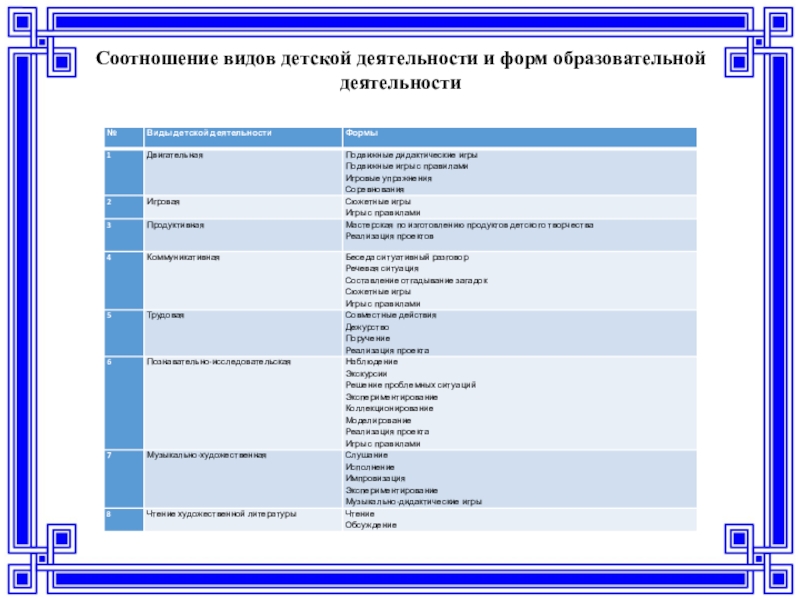 Слайд 20Соотношение видов детской деятельности и форм образовательной деятельности